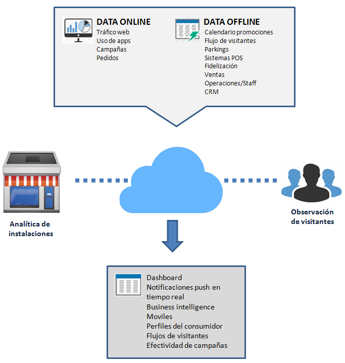 Estudia el comportamiento combinado de tus clientes en localizacion física, web y móvil, mide la conversación y el ROI de los que acuden a tus localizaciones, espacios físicos y tiendas tras recibir comunicaciones. Identifica perfiles nuevos de clients a partir de la monitorización de la Web, APP e itinerarios dentro del establecimiento o localización física.
